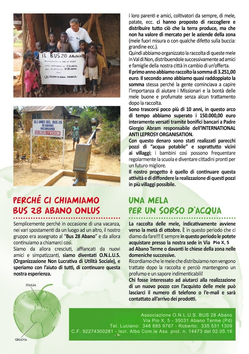 Associazione BUS 28, siamo un gruppo di amici che dopo varie esperienze vissute in Africa presso missioni dei Frati Francescani, ha dedicato la propria opera di volontariato alla realizzazione di pozzi di acqua potabile in Ghana. Da oramai molti anni operiamo per questo scopo con grandi risultati grazie anche a voi, vicino al patronato di fianco alla sede scout potete acquistare i nostri prodotti genuini della Val di Non: mele, patate, cipolle e miele con orario 9/12 - 15/18:30, oppure chiamate i seguenti numeri per prenotazioni e accordi:
